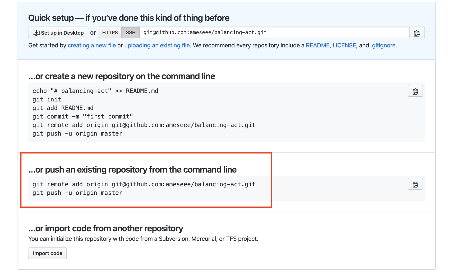 - Under the “…or push from an existing repository from the command line” directions, copy that first line, then paste it in your terminal and hit return. You will not get any feedback/output after running that.