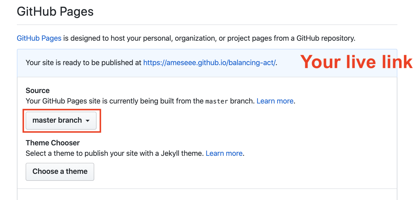 - When the page refreshes, scroll back down. In the light blue header section of the “GitHub Pages” section, you will be given a URL. That is the link to your deployed project. You may click on it and see a 404 for the first few minutes or hours depending on how busy GitHub is. Don’t panic. This is why we require you to set up GitHub Pages immediately!