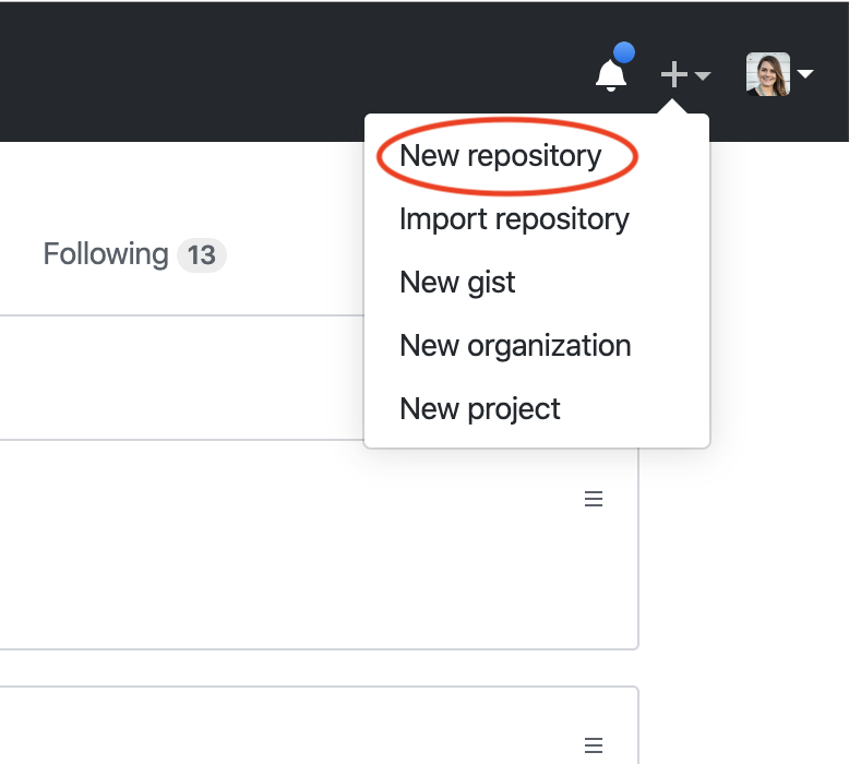 - When logged into GitHub, click the plus icon in the top right corner, then select “New repository” from the drop down.
